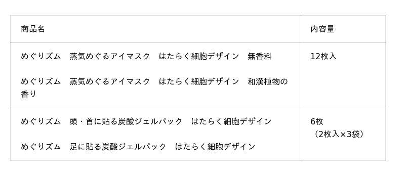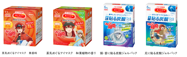 今春、この人気のある『はたらく細胞』と「めぐりズム」がコラボレーションした商品を発売します。新生活が始まる4月は、環境の変化や緊張が重なり、知らず知らずのうちに疲れがたまりやすい季節です。私たちのからだの中で日々奮闘する細胞たちのように、目・頭・足などの“はたらく部位”も毎日休まず働き続けています。本コラボ商品は、そんながんばる部位に寄り添い、じんわり心地よい使用感で気分までときほぐすことで、心地よさがめぐるひとときをお届けします。