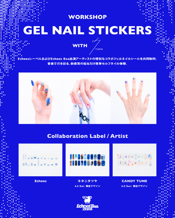 Echoesレーベルおよび、Echoes Baa出演アーティストの特別コラボジェルネイルシールで、音楽とアートを身にまとう体験を提供します。