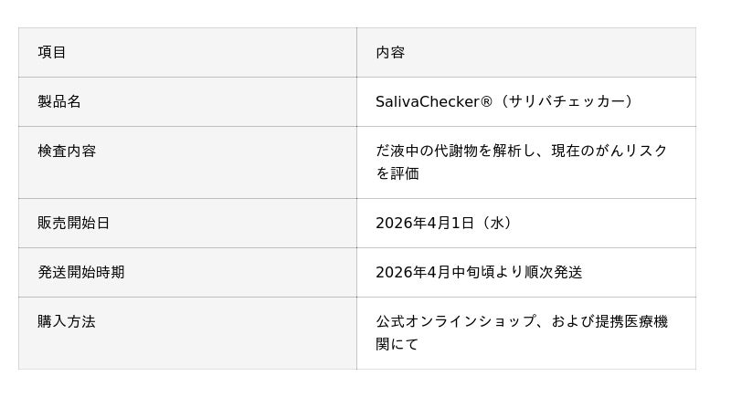 株式会社サリバテック(本社:山形県鶴岡市、代表取締役:砂村眞琴、以下「サリバテック」)は、だ液によるがんリスク検査「サリバチェッカー(R)」において、常温での保管およびポスト投函での返送を可能にした新検査キットを、本日2026年4月1日より販売開始いたします。