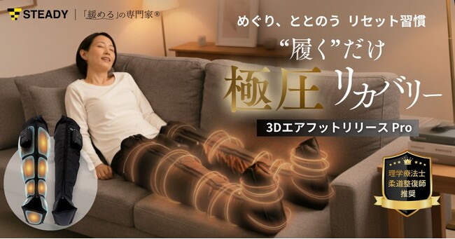 足先から鼠径部(そけいぶ)まで脚全体を隙なく覆い、最大240mmHgの業務用レベルの段階圧で脚をリセットする「STEADY 3DエアフットリリースPro」を2026年4月1日(水)より公式サイトにて先行発売。独自開発のエアバッグ「リバイブエア(TM)」 / 5種類の全自動モード / コードレス対応など細部まで突き詰めた機能性が、理学療法士・柔道整復師を唸らせる本格的な下半身ケアを実現。5日間限定で定価より5,000円OFFにてご購入いただけます。