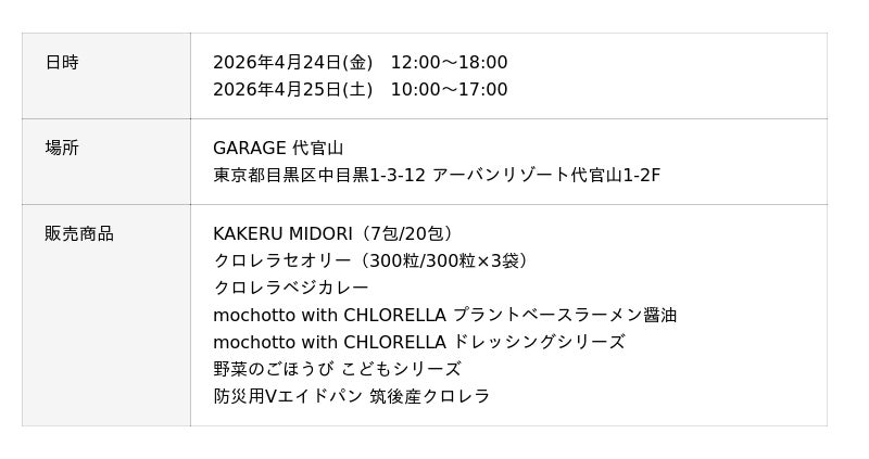 4/24(金)~25(土)、GARAGE 代官山にて開催されるViOマルシェ vol.10に出展!筑後産クロレラを使用した商品の販売、クロレラウォーターの試飲やクロレラベジカレーの試食を実施します。