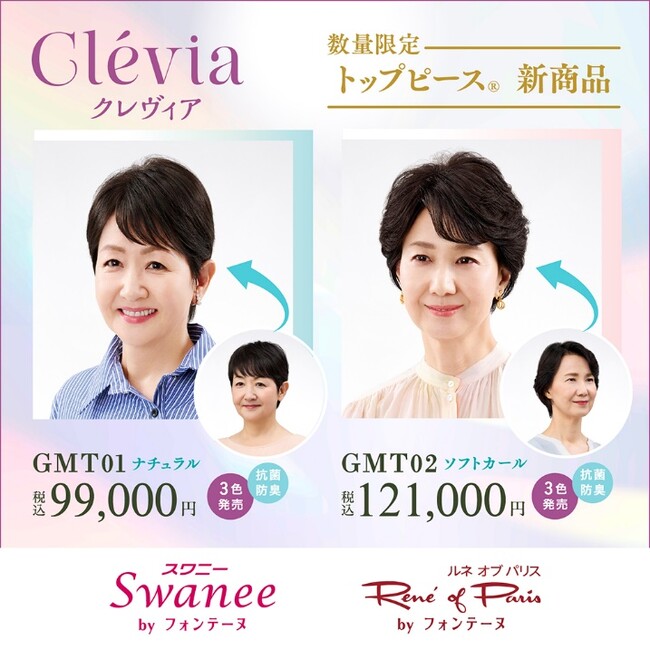 毛髪・美容・健康・医療のウェルネス事業をグローバル展開する株式会社アデランス(本社:東京都品川区、代表取締役社長 鈴木 洋昌)は、GMSで展開する女性用レディメイド・ウィッグ(既製品)ブランド「スワニー by フォンテーヌ」、「ルネ オブ パリス by フォンテーヌ」のショップにて、新ブランド「Clevia(クレヴィア)」からトップピース(R)『GMT01』と『GMT02』を4月10日(金)に新発売します。