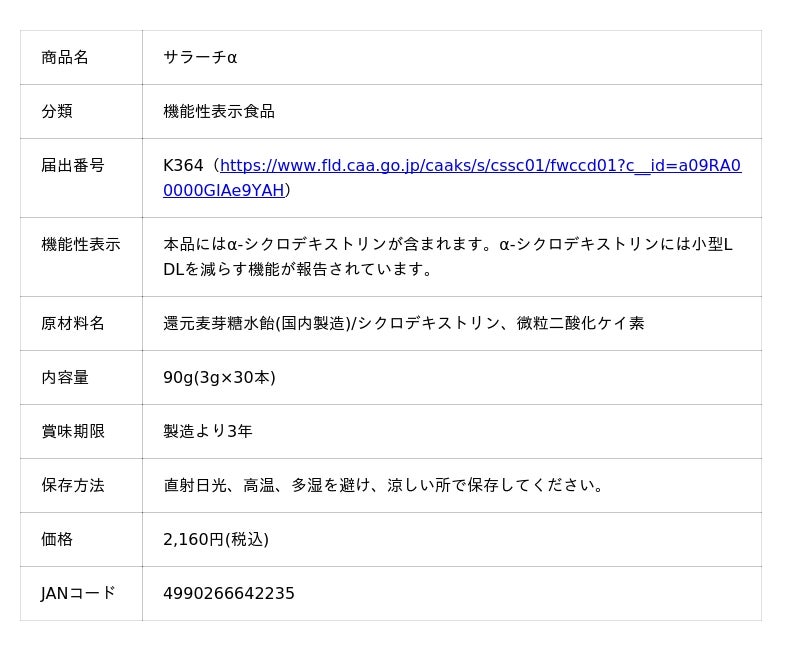 【日本初※】小型LDL(通称「超悪玉コレステロール」)を減らす新習慣!「小型LDLを減らす」機能が報告されたα-シクロデキストリンを配合した機能性表示食品『サラーチα』を新発売