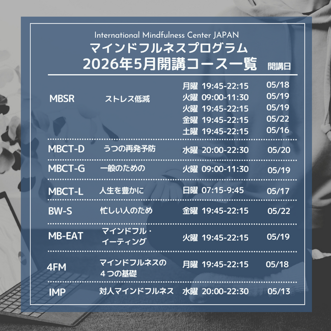 マインドフルネスへの関心が広がる一方で、科学的な裏付けのあるプログラムを体系的に学べる機会は依然として限られています。International Mindfulness Center JAPAN(以下IMCJ、運営:Kuu株式会社)は、2026年5月より、エビデンスに基づくマインドフルネスの各種コースをオンラインにて一斉開講いたします。