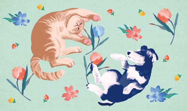 暖かな陽が差し込む花畑で寄り添いながら眠る犬と猫が、ハンカチ・バッグ・ポーチにあしらわれた春のコレクション