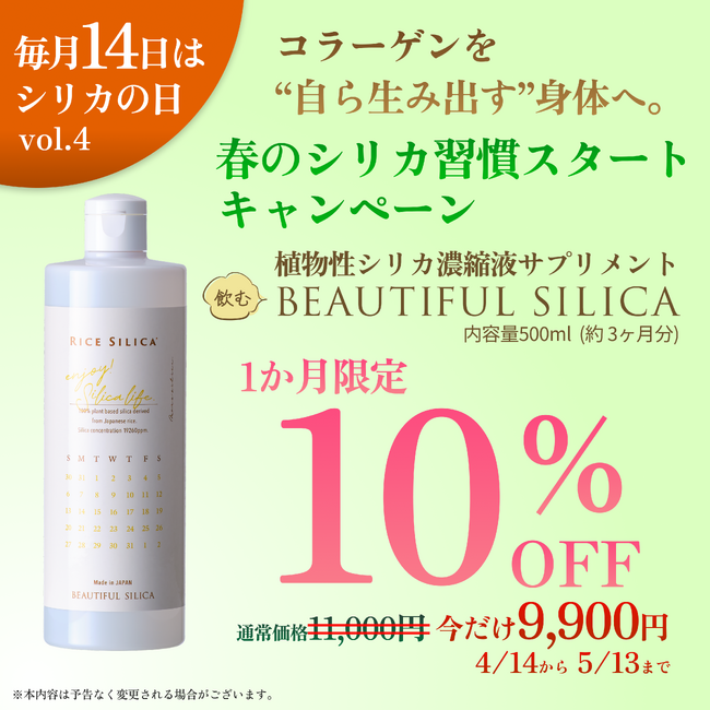 F.I.S.株式会社(本社:東京都渋谷区、代表取締役:石川淳)が展開する植物性シリカブランド「BEAUTIFUL SILICA」は、毎月14日の『シリカの日』キャンペーン第4弾として、2026年4月14日より「“飲む”BEAUTIFUL SILICA(500ml)」を対象とした期間限定10%オフキャンペーンを実施しています。