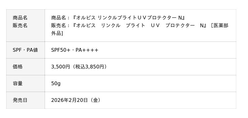 オルビス株式会社(本社:東京都品川区、代表取締役社長:山口裕絵、以下:オルビス)が2026年2月20日(金)に発売した『オルビス リンクル ブライト UV プロテクター N』[医薬部外品]は、発売初月の実績が前年比130%と伸長し、特に全国のオルビス直営店舗では前年比240%と好調に推移し、発売以来、想定を大きく上回る反響をいただいています。