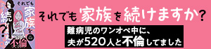 いつも残業続きで育児に協力してくれず、さらに会社の経営が苦しいと家庭に生活費も入れてくれなくなった夫。それでも妻・ねむは夫を信じ、貯金を切り崩しながら希少性疾患の息子をワンオペで育ててきた。だが、夫の鞄から精力剤と避妊具を発見。問い詰めていくと夫の本性が発覚し…。