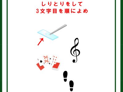 クイズです!「しりとりをして3文字目を順に読みましょう」まずはイラストを言葉に直して【難易度LV4.・辛口】