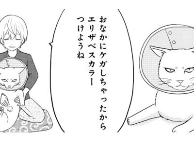 お腹をケガした「ねこまた」。エリザベスカラーをつけた姿を見た小豆とぎは…【ウチの百鬼夜行 #28】