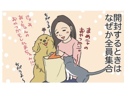 なぜだろう?ネットで購入した服が届くと全員集合。猫は値札タグで暴れ、愛犬は…【おさんぽですし! おしゃべり犬とイライラ猫の日記 #30】