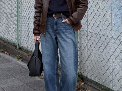 大HIT【ユニクロ】カーブジーンズの冬のハンサムスタイル。レザージャケットはブラウンならハード過ぎない着こなしに【40代の毎日コーデ】
