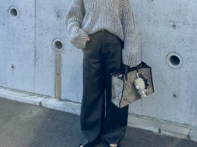 ざっくり編みのVネックニットでこなれ感を。グレー×黒で作るオトナのモノトーン【40代の毎日コーデ】