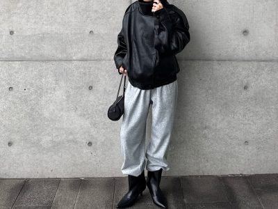 レザージャケットで魅せる冬の黒コーデ。ゆるっとしたカーブシルエットパンツ合わせがポイント【40代の毎日コーデ】