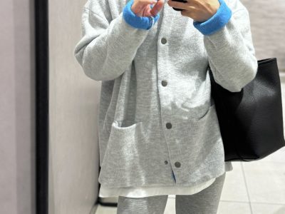 配色カーデがあれば……!ゆるっとシルエットでこなれ感を演出する、ライトグレーのカーディガンセットアップ【40代の毎日コーデ】