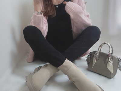 GUのパフニットで春を先取り。ピンク×ブラックで作る甘さを抑えた旬のカジュアル【40代の毎日コーデ】