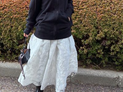 かなり使える【ユニクロ】スウェットパーカ。白スカートを合わせた大人の春の甘辛MIX【40代の毎日コーデ】
