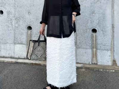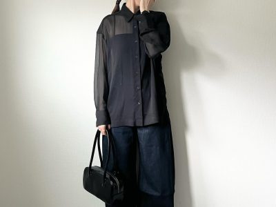 【ユニクロ】大人の「シアーシャツ」コーデ。黒×白でひきしめて上品な肌見せが完成【40代の毎日コーデ】