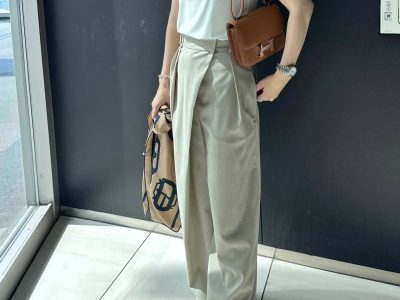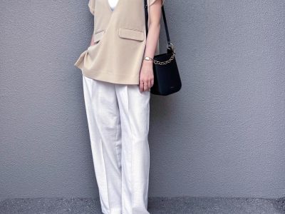 小物使いが洗練見えの秘訣。白ノースリーブ×ベージュワイドパンツでつくるきれいめスタイル【40代の毎日コーデ】